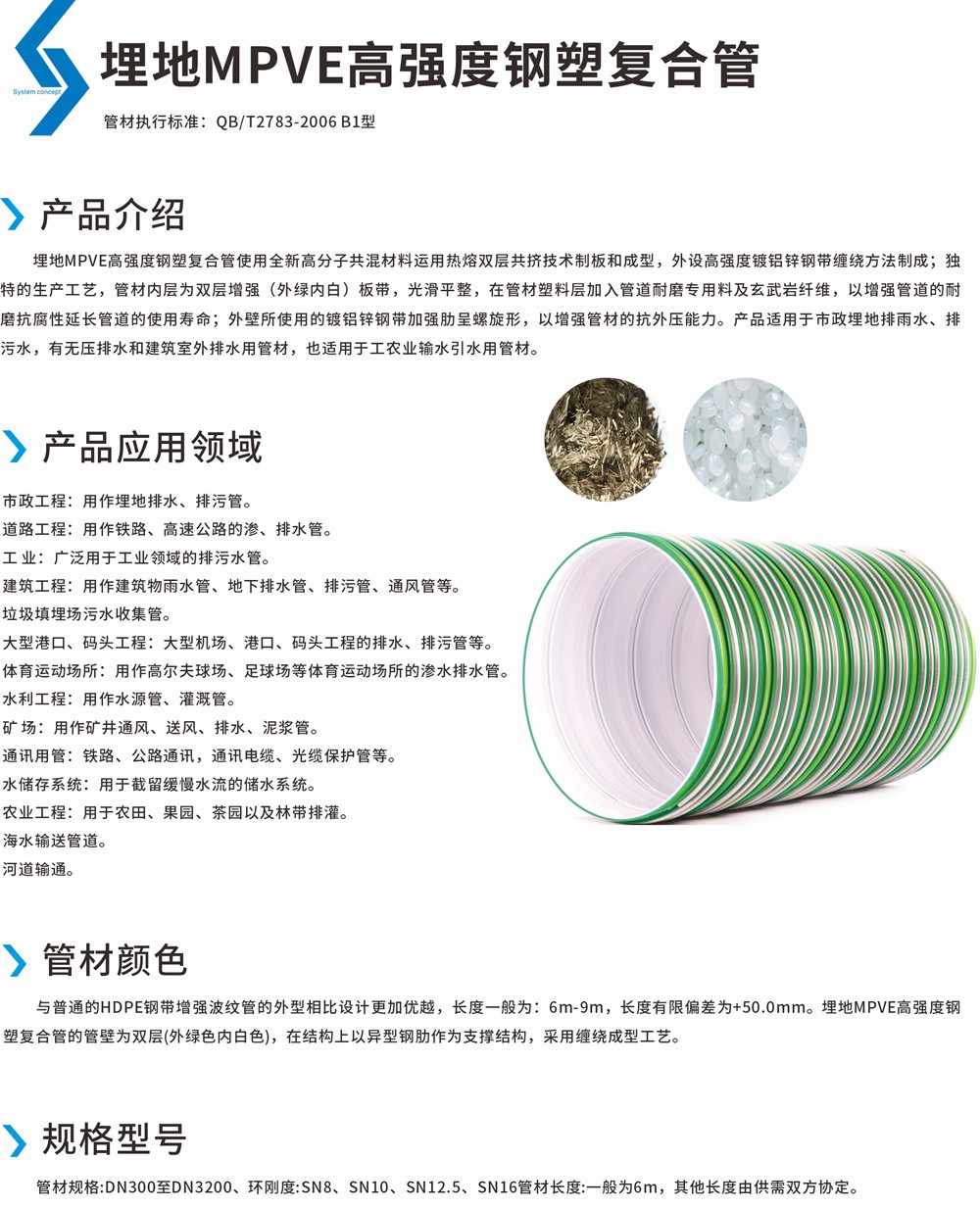 埋地MPVE高強(qiáng)度鋼塑復(fù)合管使用全新高分子共混材料運(yùn)用熱熔雙層共擠技術(shù)制板和成型,外設(shè)高強(qiáng)度鍍鋁鋅鋼帶纏繞方法制成;獨(dú)特的生產(chǎn)工藝,管材內(nèi)層為雙層增強(qiáng)(外綠內(nèi)白)板帶,光滑平整,在管材塑料層加入管道耐磨專用料及玄武巖纖維,以增強(qiáng)管道的耐磨抗腐性延長管道的使用壽命;外壁所使用的鍍鋁鋅鋼帶加強(qiáng)肋呈螺旋形,以增強(qiáng)管材的抗外壓能力。產(chǎn)品適用于市政埋地排雨水、排污水,有無壓排水和建筑室外排水用管材,也適用于工農(nóng)業(yè)輸水引水用管材。