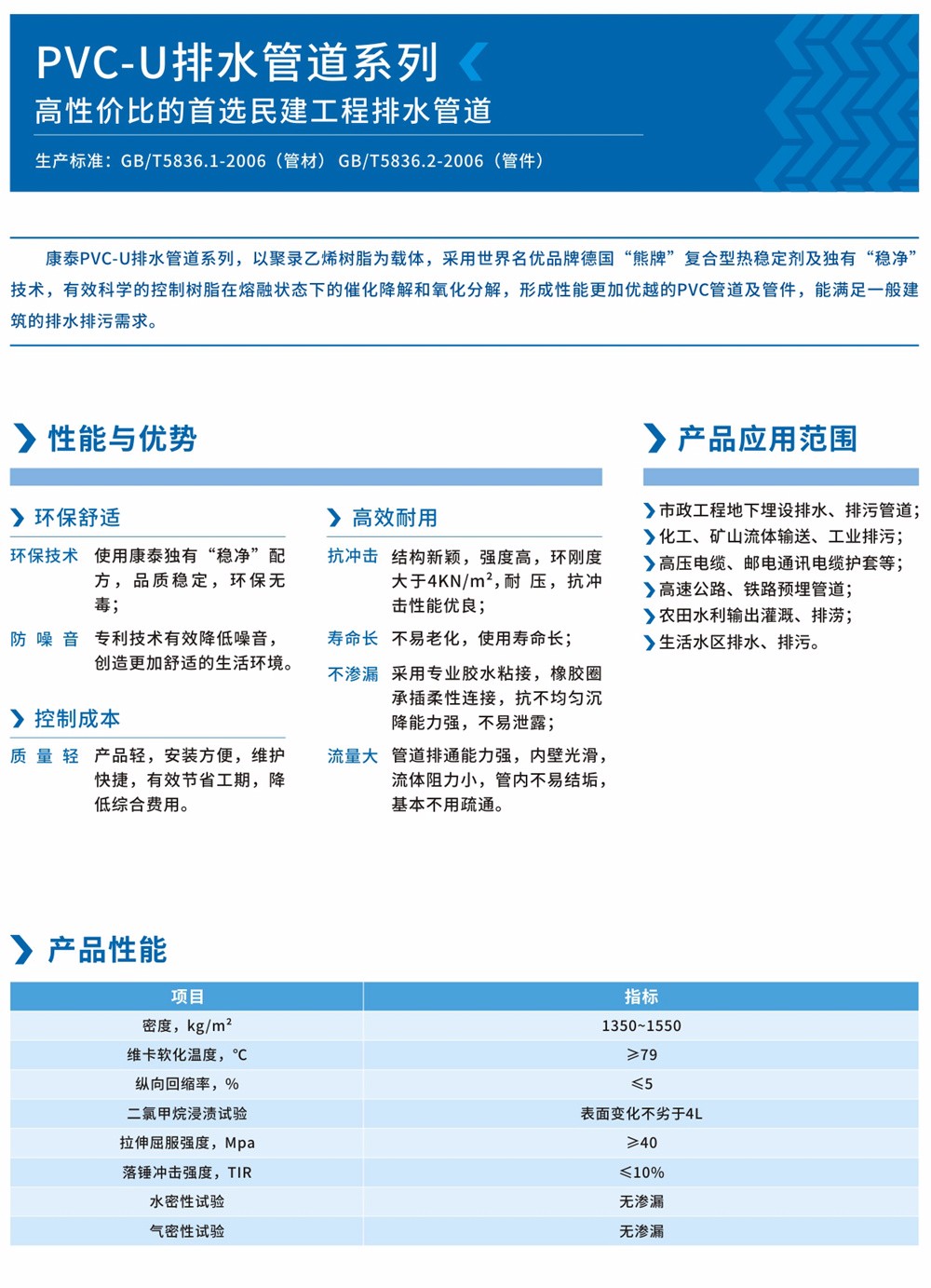 生產(chǎn)標準:GB/T5836.1-2006(管材) GB/T5836.2-2006(管件)